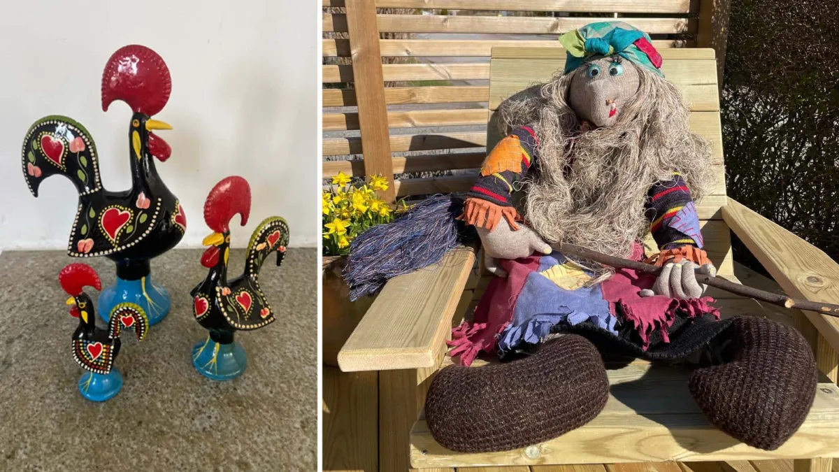 Höger: Handgjord påskkärring med kvast (Tradera)